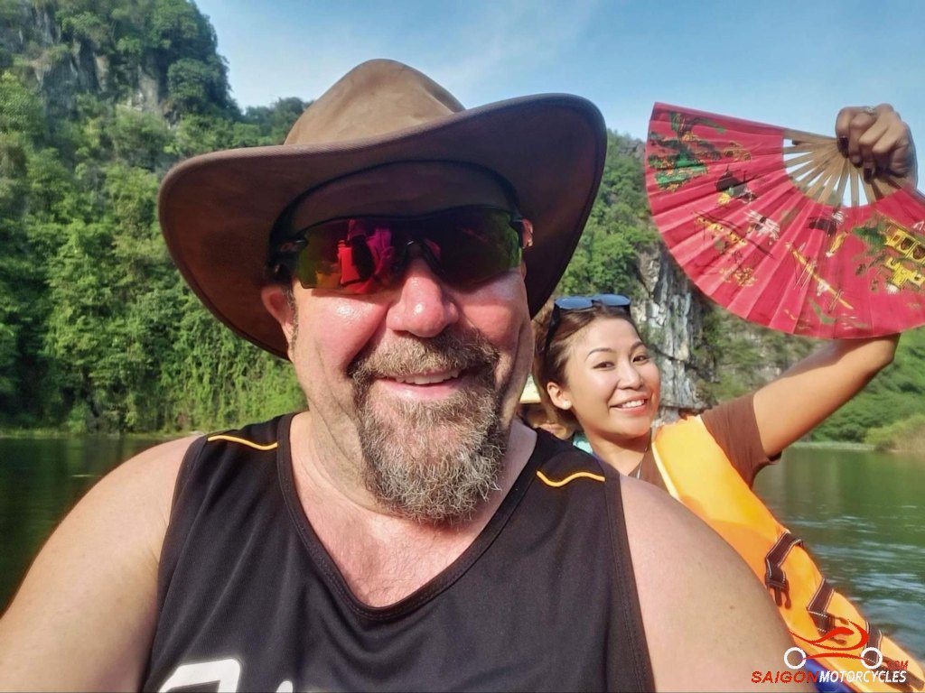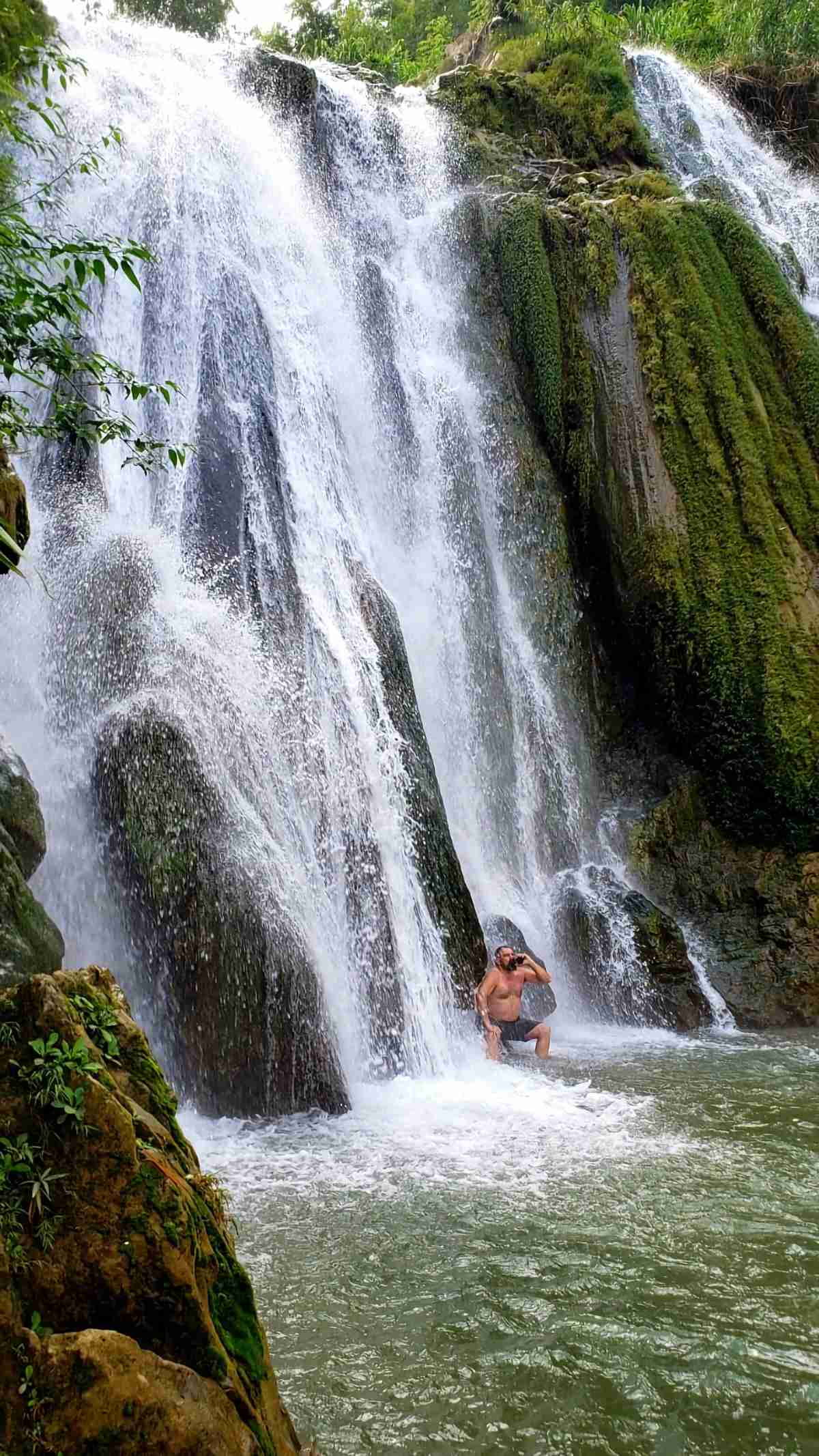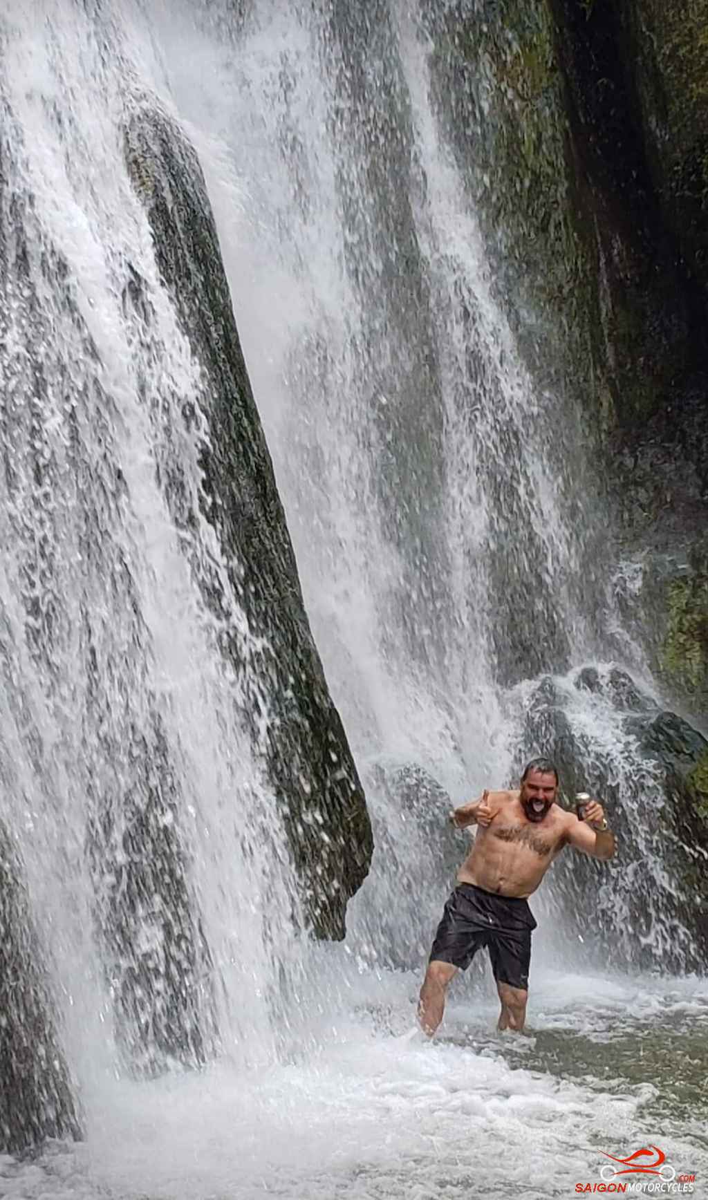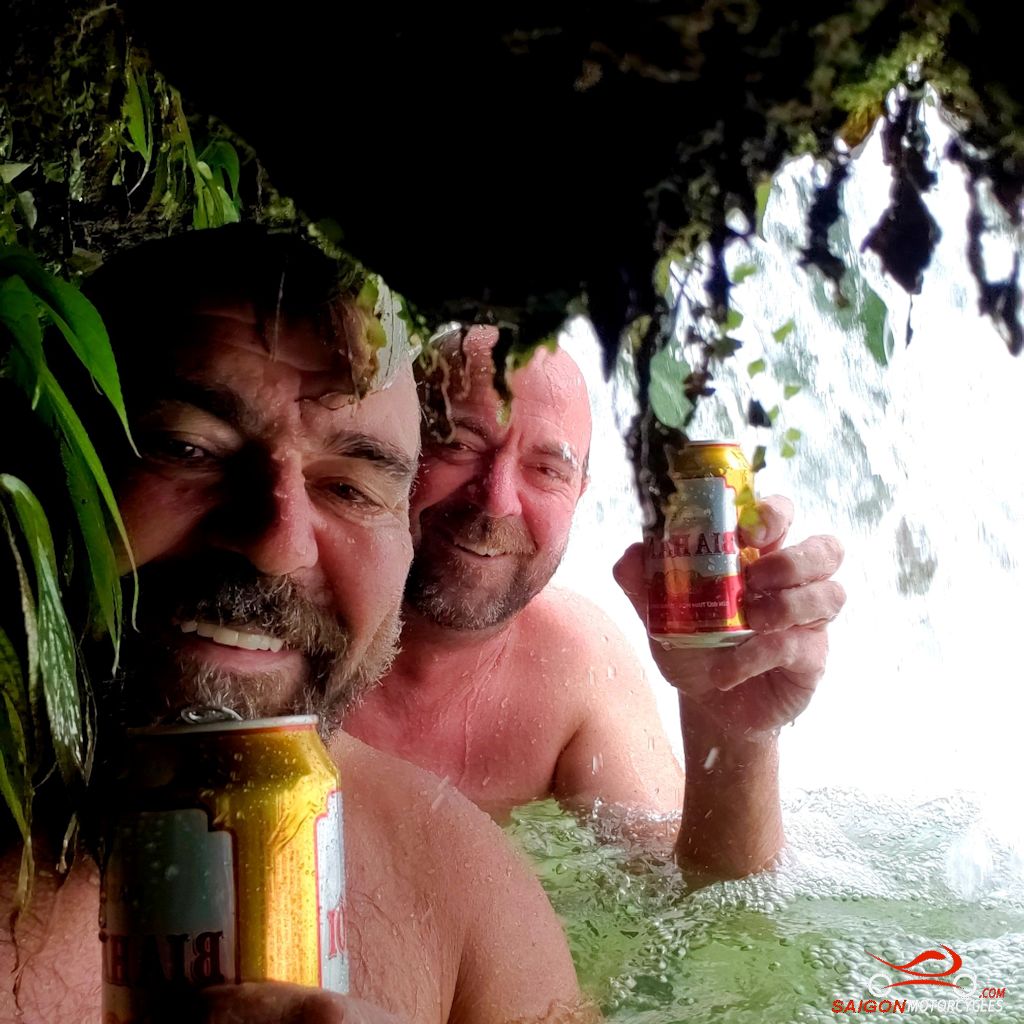The morning ride is a pleasant one following the Hoang Long and Boi River systems to Uncle Ho’s Road. Shortly after crossing provinces you turn right and follow the River to this awesome Waterfall.